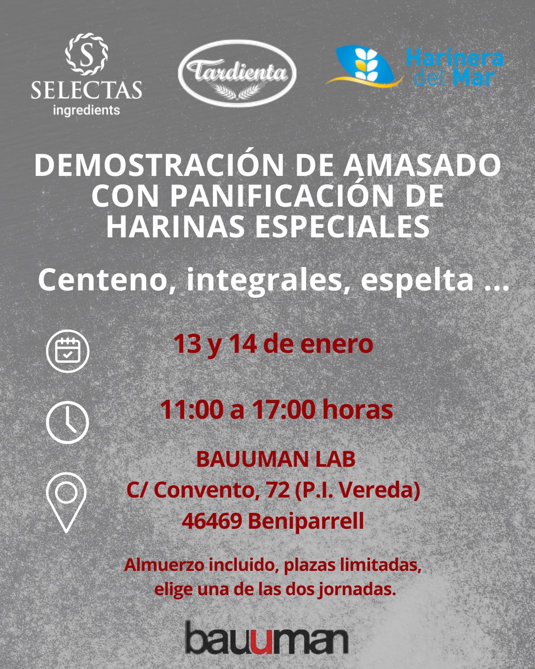 DESCRIPCIÓN: Los días 13 y 14 de enero haremos una demostración de amasado y planificación de Harinas especiales!! Centeno, integrales, espelta, etc… Nos gustaría contar con tu presencia.